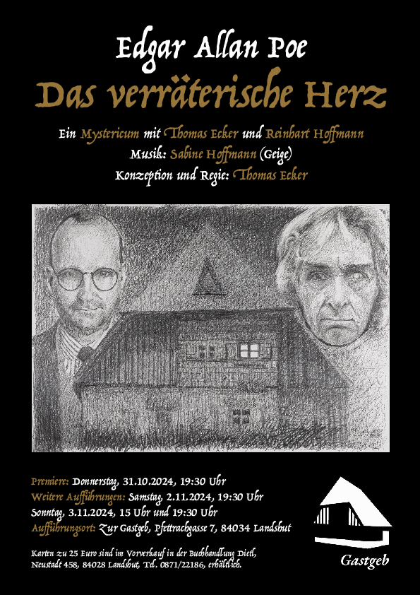 Das verräterische Herz nach der gleichnamigen Erzählung von Edgar Allan Poe wird als >>Mysterium<< mit Elementen aus Schauspiel, inszenierter Lesung, Live-Hörspiel und mentalmagischer Show präsentiert.